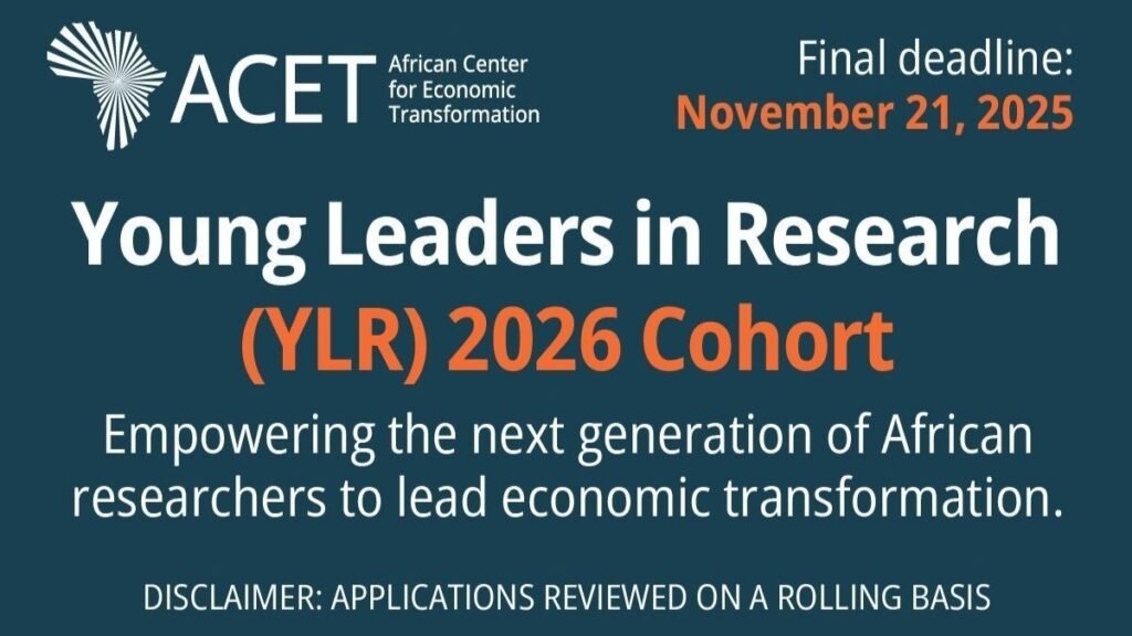 Les candidatures sont ouvertes pour l’édition 2026 de la bourse Jeunes Leaders en Recherche (YLR) du Centre africain pour la transformation économique (ACET). Cette bourse d’une durée de douze mois vise à accompagner les jeunes chercheurs africains en économie et disciplines connexes, afin de produire des travaux ancrés dans les réalités du continent et utiles pour les politiques publiques.